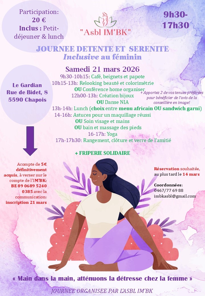 Journée détente et bien-être inclusive. Tous les renseignements via https://www.facebook.com/p/ASBL-IMBK-61559468126851/